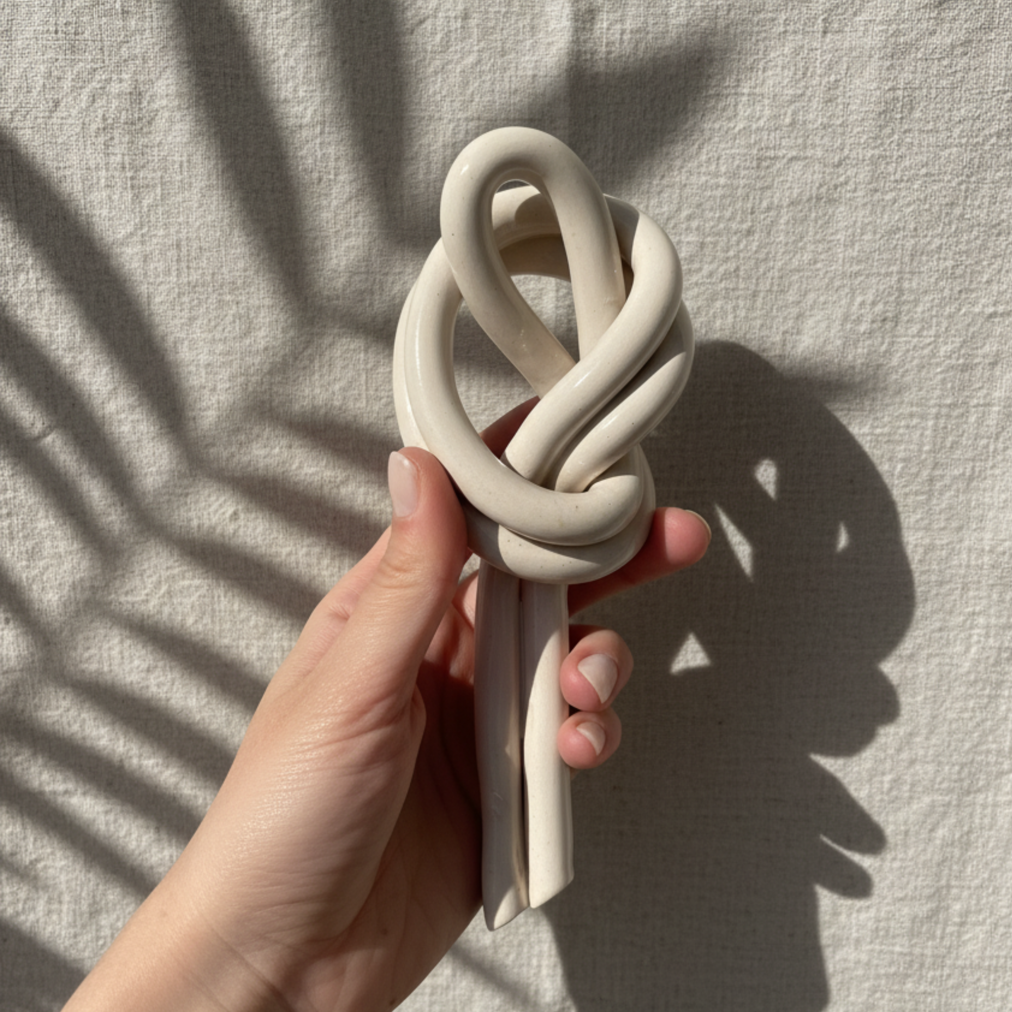 Pieza de cerámica, con su diseño de nudo atemporal, es una pieza única que combina la simplicidad moderna con la sofisticación artesanal. Su acabado esmaltado en un tono neutro y brillante resalta la fluidez de la forma, creando un objeto decorativo elegante. Es el detalle perfecto para añadir un toque de diseño contemporáneo y textura a cualquier rincón de tu hogar.